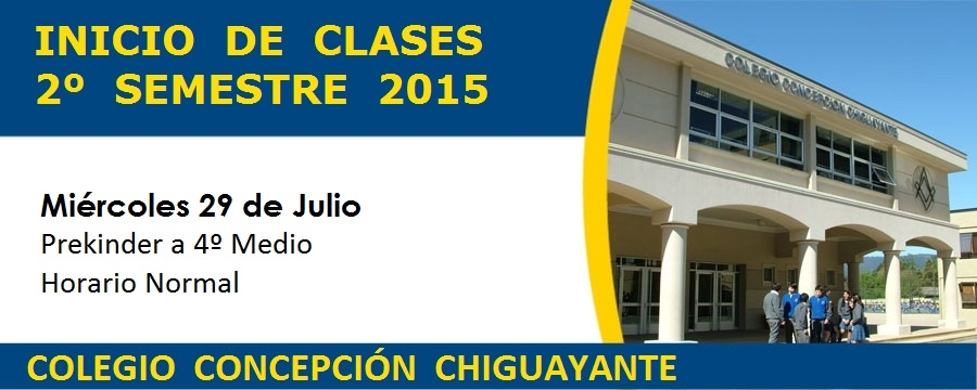 Junto con saludarles informo a ustedes, que el inicio de clases para el segundo semestre será el día Miércoles 29 de Julio, puesto que los días lunes 27 y martes 28 estarán destinados para la Jornada de Organización y Planificación Curricular del segundo semestre, como lo establece el Calendario Escolar Regional año 2015, según resolución exenta Nº3426 del 19 de diciembre de 2014.